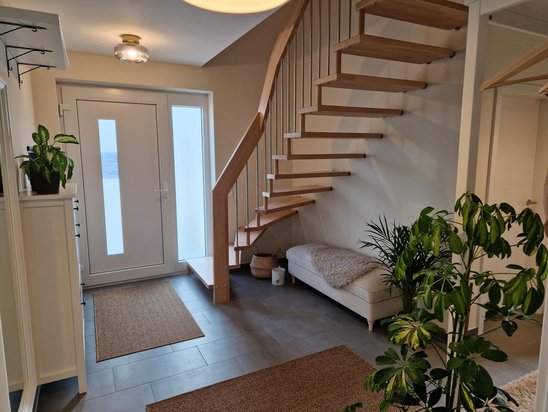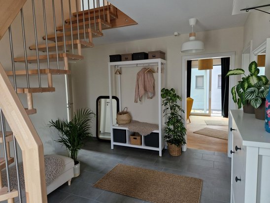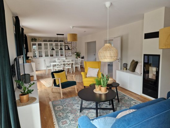 In der Küche haben Sie genug Platz für gemeinsame Kochabende mit den Liebsten oder ein schnelles Frühstück unter der Woche. Wer hin und wieder lieber im Home-Office arbeitet, kann sich neben dem Wohnzimmer ein Arbeitszimmer einrichten.